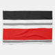 Denna handduk ska look som är underbar i ett kök med en svart som är röd, vit och silverdekoren.