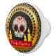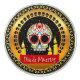 Sockerskalle i mitten av en liten svart cirkel med vita döskallar och tre gulters brinnande ljus. "Detta kommer från Day of the dead och kallas även döskallarna för socker från Dia de los Muertos.