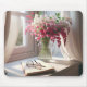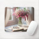 Rosa och vit blödande hjärtbukett i Mason burk genom ett solfönster med bok och ögonfransar.