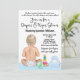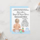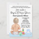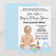 Blöjor och våtservetter baby shower inbjudan med söt liten pojke med leksaker på en söt blå prickig bakgrund.
