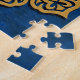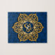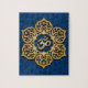 Ett ljust gult Aum symbol sitter insida av en stylised lotusblommablomma. Cirkulärmönster markeras för att skapa ett ljust sken på ytan som sitter på en djupblå bakgrund. Sex eleganta löv att ne ut från centrera av designen för att skapa ett härligt symmetriskt mönster. Denna unika pusseldesign är en slå framställning av detta andliga symbol.