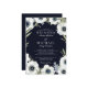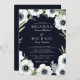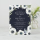 Mörka midnatta blom- bröllopinbjudningar som presenterar en djup blommigt för anemon för marinbakgrund- och blått- och vitvattenfärg. In mot centrera är din information om bröllop däribland namnen av bruden, och brudgummen vilar i vittext.
