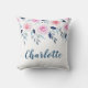 Den eleganta rosa ros- och blåttlövvattenfärgen planlägger med anpassadetext för ett namn eller en monogram på en dekorativ kudde.