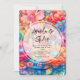 En bröllopsinbjudan med en färgrik samling vår- och sommarblommor. Rosa orange och blå dominerar färgschemat. Ljus och djärv blomsterarrangemang utstrålar glädje. :)