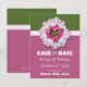 Blommiga Spara Datum Annonseringar med en vacker 2-tons kronblad blomma där innerfärgen bildar formen av ett hjärta. Annonserna är designade i rosa och grönt med anpassad vit text.
