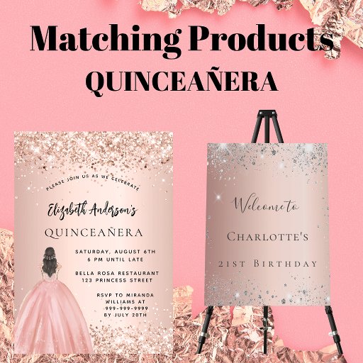 En modern, snyggt och glamorös inbjudan till en Quinceañera, 15:e födelsedagsfesten. En ro guld-bakgrund med blommor av rosa, en flicka med en boll-gryning. Namn är skrivet med ett modernt handskript i stil. Anpassa och lägg till information om party.