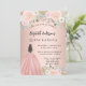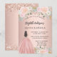 En modern, snyggt och glamorös inbjudan till en Quinceañera, 15:e födelsedagsfesten. En ro guld-bakgrund med blommor av rosa, en flicka med en boll-gryning. Namn är skrivet med ett modernt handskript i stil. Anpassa och lägg till information om party.