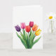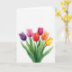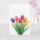 Designad med en akvarellstil bukett av sex slutna blomknoppar som reser sig från den nedre kanten mot en ljus vit bakgrund, håller detta kort fokus på enkel naturlig skönhet. Knopparna fläktar utåt i en mjuk båge, som om de lutar sig mot varandra som nära vänner som delar en tyst stund. Färgerna sträcker sig över blommorna från djup lila och mjuk fuchsia till scharlakansröd, karmosinröd, mandarin och gyllengul, med genomskinliga tvättar som får varje kronblad att se mjukt skiktat ut. Smala gröna stjälkar och lövkluster i varierande nyanser av grönt ger djup och en jordnära, trädgårdsfrisk känsla. Det generösa öppna utrymmet runt buketten ger scenen plats att andas, som en outtalad paus