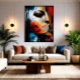 Ett ansikte framträder ur djärva penseldrag, där brinnande rosor och djupa skuggor avslöjar dolda känslor. En visceral porträtt av själen, som blandar skönhet, smärta och mystik i lager av färg och textur.