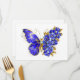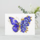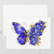 Smycken, blå, safir, gnistrande blomfjäril med vinge dekorerad med blå, dyrbara blommor med gyllene blad på vit bakgrund.