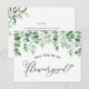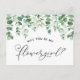 Fråga dina vänner och familj om de vill vara en del av din bröllopsdag med detta blomstermönstrade "Vill du vara min blomflicka?"-kort med akvarell-eukalyptus och feminin kalligrafi. Matchande artiklar finns tillgängliga. Förslagskort till brudparty