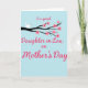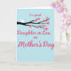 Det här kortet har en lugn ljusblå bakgrund som känns som en öppen vårhimmel och sätter en mild och vänlig ton ❤️. I det övre vänstra området sträcker sig en enkel gren inåt med mjuka rosa blommor, där varje blomma har en djupare rosafärgad mitt som ger en öm beröring. En liten vit fågel sitter på grenen med en liten röd näbb och ett mörkt öga, vänd åt höger som om den tyst beundrar blomningarna med en söt och tillgiven blick. Huvudtexten sitter under illustrationen i mitten av kortet, ordnad i en snygg och lättföljlig stapel. Den lyder "Till en speciell svärdotter på mors dag" i rik fuchsiafärg som sticker ut tydligt mot det blå. Det generösa avståndet runt orden och konstverket ger allt utrymme att andas och håller utseendet enkelt och varmt 🌼. Blommorna samlas nära grenens spets medan fågeln sitter kvar något närmare vänster, vilket skapar en balanserad hörndetalj