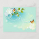 En abstraktens bakgrund med cirklar och snabba former. Färg är en lugnande grönt, turkos och gult. Ett par orange- och gult-butterfanger hovrar runt några känsliga blommar i blommarna med grönt löv och brunt grenar. Det har en ny, beundransvärd magisk känsla.