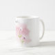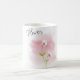 Kopp har en känslig vit keramik som är försedd med en illustration av blommigten. Bilden består av två blommar på ett enda stam, som ställs in mot en mjuk bakgrund av rosan. Ord "Flower" står ovanför illustrationen i ett kursivt teckensnitt med snyggt, som läggs till kopp:s enkla och elegant estetik.