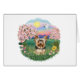 Vår blommar i skuggor av rosa utgör bakgrundsfokus för Yorkshire Terrier . En duva flyger över den här tydliga och soliga vår-dagen.