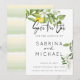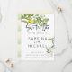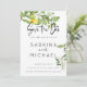 Ett nytt tema för citron och blommar i avslappnaden stil och bröllop spara datum - handmålade citroner och blommar på framsidan medan gult i blek och löv grönt i vattenfärgstrypning i rand är på baksidan - handskriven kalligrafi parad med ett rent icke-seriöst typsnitt för ett modernt rosterbruk. Design av ©WhimsicalArtwork™ för BarefootBride™. Detta är en del av en komplett blandning och matcha bröllop-sviten samt födelsedags- och babydusch. Kontakta indy.designer@yahoo.com om du behöver hjälp med att anpassa designen