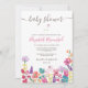 Sommarmodern, torkad vild blommor blommigt vattenfärgsbabydusch party med handmålad pastellgrönt, klarfärgad rosa, rött, lila, blått och gula blommor arrangemang och modern och chic-manusgrafi.