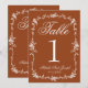 Klassiska och eleganta botaniska blommiga vita och brända orange bröllopsbord nummer. Som du ser har den en rostig gammaldags bakgrund med vit skrift som matchar hela sviten. Och vit kontur blommig ram.