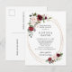 Elegant och prisvärd vykort inbjudan till bröllopsfest. Designen har en bukett blommor i burgunderöd djupröd och rosafärgad med grönska och guldtryck oval abstrakt. Matchande föremål i denna samling.