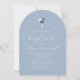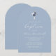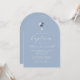 Denna eleganta bågformade dopinbjudan har en akvarellbouquet av dammig blå och marinblå blommor och silvergrönska på ett silverfärgat falskt foliekors, ovanför orden "vänligen kom och dela med er av dopet av vår son" i elegant vit handskriven kalligrafi och kursiv stil på en dammig blå bakgrund. Personifiera den med namnet i vit skrivstil och detaljerna i sans serif-teckensnitt. Baksidan av kortet är enfärgat dammig blå. Perfekt för en pojkes dop.