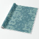 Blommig teal tapet med ljusblå utsmyckade mönster; visas utrullad och platt. Elegant design framkallar en lugn, sofistikerad atmosfär.