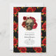 Mörkröd, svart och guld gotisk bröllopsinbjudan med en dödskalle dekorerad med röda rosor och ett dramatiskt ros-mönster. QR-koden på baksidan dirigerar till er bröllopssida där folk kan lära sig mer och svara.