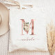 Denna eleganta shoppingväska har ett stort bokstavsmonogram "M" i falskt roseguld-folie, dekorerad med en vintage elfenbensfärgad blomsterbukett med grönt och rosegult bladverk. Personalisera den med hennes namn i roseguld handskriven text, med svängar i början och slutet. Blir en perfekt brudtärna-gåva! Andra alfabetets bokstäver finns tillgängliga i vår Zazzle-butik. (För att behålla svängarna, ersätt endast namnets bokstäver.)