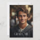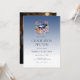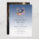 Denna inbjudan till examensbrunch presenterade en examenshatt med en blomsterkrans på en blå till vit ombre och anpassningsbar mörkblå typografi.