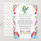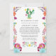 Blommig mexikansk fiesta-tema reducerad bröllopsinbjudan. I dessa osäkra tider kan det hända att du måste hålla ett mindre bröllop än vad som ursprungligen planerats. Detta annonskort tar bort det pinsamma och tar en tyngd av din hjärna! Du kan dessutom ge ett alternativ att gå med dig på en virtuell ceremoni.