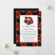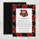 Mörkröd, svart och guld gotisk reducerad bröllopsgästlista kungörelse med en dödskalle och ett dramatiskt ros mönster. I dessa osäkra tider kan det hända att du måste hålla ett mindre bröllop än vad som ursprungligen planerats. Detta annonskort tar bort det pinsamma och tar en tyngd av din hjärna! Du kan dessutom ge ett alternativ att gå med dig i en virtuell ceremoni.