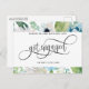 Nyligen blivit förlovad? Grattis! Dela dina fantastiska nyheter med familj och vänner med detta eleganta förlovningskort! Underbar design med handmålad akvarell blomsterbakgrund med blommor och blad i vitt, dammigt blått och gröna toner, med vit sektion i mitten med era namn och frasen "Blev förlovade" i vacker handskriven kalligrafi. Möjlighet att lägga till eget meddelande och extra information (som information om förlovningsfest eller "spara datum" information) om ni önskar, för att lägga till fler textrader kan ni välja att anpassa ytterligare. Baksidan med handskriven kalligrafi och blomsterdetalj i botten.