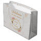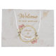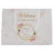 Denna eleganta geometriska blomsterbröllops-välkomstpåse rekommenderas för ett destinationbröllop och kombinerar flera trender från 2019: geometriskt, marmor och metalliskt (guld). Den oregelbundna guldbården har blomsterbuketter med vita och rosa orkidéer upp och ner över de övre vänstra och nedre högra delarna av två gula hexagoner som ligger över varandra. Bakgrunden är vit marmor. Titeln "Välkommen" och brudens och brudgummens namn är skrivna med en kalligrafisk stil. All text har en gyllene gul färg, likt guldbården. Den antika blomsterbuketten med rosa och vita orkidéer är från ett gammalt gratulationskort av Bertha Maguire (1862-1910), nu i public domain.