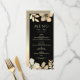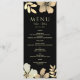 Modern, elegant, chic, svart bröllopsmeny med akvarellguld blommor.