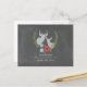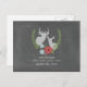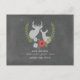 En bröllopsinbjudan med en illustration av röda och blå blommor och grönska arrangerade runt bröstbilder av en hjort och en hona. Bakgrunden är inspirerad av en svart tavla. Anpassa texten. Sök efter matchande bröllopsinbjudningar och mer på Jill's Paperie.