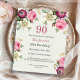 Anpassbara prisvärda pappersinbjudningar till 90-årsdag med vackra akvarellrosor och magenta blommor på en pastellgrön bakgrund.