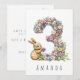 Gör en lillas 3-årsdag extra speciell med detta charmiga kort med en delikat akvarellillustration av siffran 3, vackert utformad av små, färgglada pastellfärgade blommor. En söt kanin står bredvid siffran och nosar lekfullt på blomman, vilket ger en touch av sötma och glädje till designen. Oavsett om du är förälder, mor- eller farförälder eller familjevän, är detta förtrollande kort säkert att ge en glad stund åt både barnet och dess nära och kära.