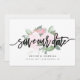 Denna design har en mjuk rosa akvarellblomma komposition bakom orden "spara datum" i fet svart handskriven stil. Paret namn och bröllopsdetaljer visas nedan och kan anpassas. Grafik ©Create The Cut