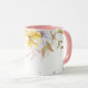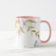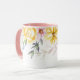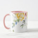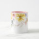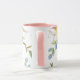 Denna blommiga koppen har vackra pastellbilder av blommor runt den övre kanten av koppen mot en vit bakgrund. Den visade inredningen är rosa. Välj din färg för inredningen så att den passar din smak. Anpassa denna kopp eller köp som den är utformad.