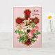 Rött och guld vintagekors med en mängd vackra blommor har noggrant retuscherats för att framhäva de underbara detaljerna. Det finns vita påskliljor och frodiga rosa rosor. Framsidan har en rik rosa bakgrund. Ett vackert påskkort som är redo för dig att personliggöra inuti.