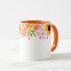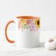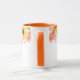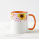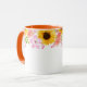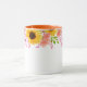 Denna tvåtonsblommiga mugg har vackra sommarblommor av rosa vildrosor, korallpoppies och glada solrosor runt muggens övre kant. Handtag och insida som visas är orange.