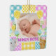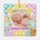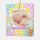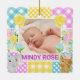 Den här söta bebisannonseringen har en fridfull nyfödd-bild som är inramad av en mjukt pastellakt floralt-rutig kollaž. Den lapptäcks-inspirerade ramen blandar gingham, prickmönster och ömtåliga mönsterblock i rosa, blått, gult och lila med charmigt illustrerade blommor och söta karaktärs motiv. Blandningen av texturer ger en mjuk, handgjord känsla med en varm och lekfull stämning. Perfekt för födelsetal, barnkammardesign eller personliga presenter, passar denna design med mjuka färger, lekfulla detaljer och innerlig charm.