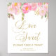 Kärlek är sött Vänligen ta en godsak skylt med rosa och guld blomsterdesign och vacker kalligrafi. Denna feminina akvarelldesign har rosa och gula blommor med en touch av grönska. Den har elegant handritad bokstavsstil och typografi i guld, med "Kärlek är sött" handritat i virvlande kalligrafi. Vänligen bläddra igenom min butik efter matchande föremål.