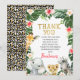 Sött safari-tema födelsedags tacksamhetskort med fyra akvarell djur från djungeln, några hibiskus och frangipani blommor samt mörkgröna tropiska blad. En söt safari födelsedags tacksamhetskort design som är ett bra sätt att tacka gästerna för att de kom till din lilla flickas safari-inspirerade födelsedagsfest.