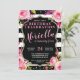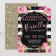 Denna blommiga svart-vitrandiga inbjudan kan anpassas helt efter valfritt evenemang. Denna inbjudan är för närvarande utformad för att vara en elegant födelsedagsinbjudan med svart-vita ränder, rosa blomsteraccenter och detaljer med falskt guldglitter. Se till att välja "anpassa ytterligare" om du vill använda den här för ett annat evenemang för att få tillgång till den fullständigt anpassningsbara mallen. Denna inbjudan är populär för födelsedagar, bröllopsdusch, möhippor och mycket mer!