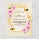 En inbjudan till en 50-årsfest (eller vilken ålder som helst). Gul och vit bakgrund med ett bikakemönster. Med en falsk geometrisk ram i guld. Dekorerad med rosa tropiska blommor, hibiskus och glada humlor. Mallar för namn och festdetaljer. Namnet skrivs med en modern handskriven typsnitt. Perfekt för en sommar-tea i trädgården eller på bakgården.