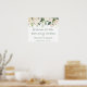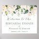 Välkomstskylt för repetitionsmiddag med vackra romantiska akvarellrosor och hortensia i full blom i en pastell mjuk vit krämfärg med grönskande lövverk.