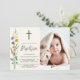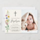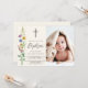 Denna blommiga dopfoto-inbjudan har vildblommor och ett kors med stilfullt skrivstilstypografi på en mjuk krämfärgad bakgrund.