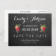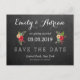 Designer, moderna, trendiga blommiga accentuerade spara datum vykort på kritkort bakgrund. Anpassa alla detaljer för spara datum online här och nu och när du är klar med att anpassa dessa designer spara datum kort och du beställer... dessa exakta professionella, fullfärgade, glansiga vykort kommer att levereras till din dörr - var som helst i världen!! Kunde inte vara enklare!!