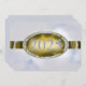 Knappen som omger blommigten ovanpå ett gyllene band som har blommigt design. Himlar blå grumlig bakgrund. Kortets baksida har en himlar blå bakgrund med guld-bokstäver för tillkännagivande för studenten.