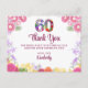 Blommigtens 60-årsdag tack för vykort 60-blommors chic. Visa din tacksamhet i stil med det 80:e födelsedagskalortet för eleganten som innehåller klara accenter för blommigt och ett hjärtligt budskap. Kortets framsida visningar ett stort "60" i färgstark blommigt och ord "Tack" i ett fet skript, följt av ett anpassade-meddelande. Baksidan har en rörande uppskattningston för att ha firat en milstolpe på 80 underbara år fylld med kärlek, skratt och minnen. Det här kortet är perfektens sätt att tacka dig för att du är närvarande på din speciella dag och för alla generösa gåvor som du har fått. Anpassa det här tackkortet enkelt så att det återspeglar dina egna unika känslor. Njut!